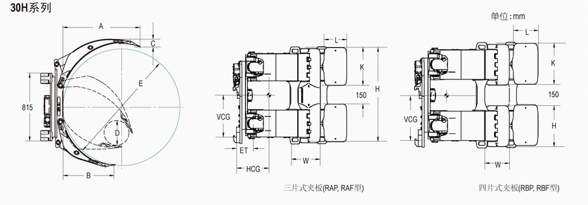 Capacity 承載能力(kg) | Catalog Order NO 型號 | Mounting Class 安裝等級 | Roll Range 紙卷直徑 D-E(mm) | Long Arm Length 長臂長度 A(mm) | Short Arm Length 短臂長度 B(mm) | Long Arm Thickness 長臂厚度 C(mm) | Short Arm Type 短臂類型 | Contact Pad Size Long Arm 長臂夾板尺寸 K×L(mm) | Contact Pad Size Short Arm 短臂夾板尺寸 H×W(mm) | Vertical Ctr.of Gravity 垂直重心VCG | Weight 自重(kg) | Effective 失載距ET(mm) | Horizontal Center of Gravity 水平重心CGH(mm) |